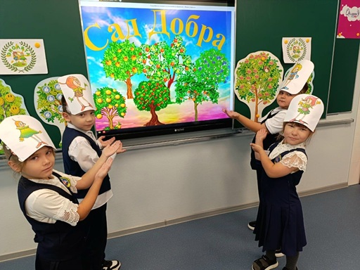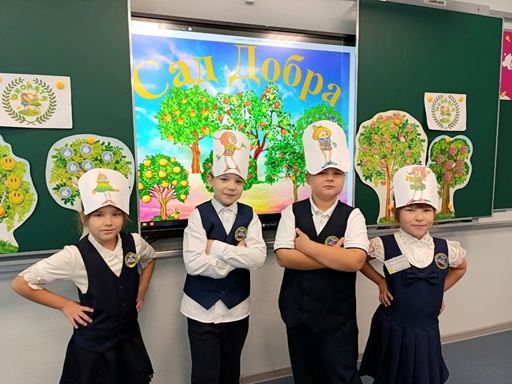 В гости к первоклашкам пришли эколята, которые рассказали ребятам, какую пользу приносят деревья людям, животным и окружающему миру. Тихоня и Ёлочка призвали детей проявлять доброту и заботиться о деревьях, не ломать ветки, не обрывать соцветия и плоды. Вместе с ребятами эколята посадили Сад добра. Каждое дерево олицетворяло добрый поступок по отношению к природе.
